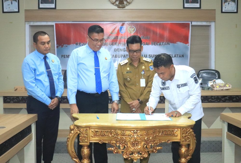 Wartaniaga.com,Kandangan— Nota kesepakatan kerjasama antara Kejaksaan Negeri (Kejari) Hulu Sungai Selatan (HSS) dengan Pemerintah Desa (Pemdes) se-HSS resmi diperpanjang untuk dua tahun ke depan. Penandatanganan Memorandum of Understanding (MoU) ini dilaksanakan di Aula Rakat Mufakat, Sekretariat Daerah Kabupaten HSS, Selasa (29/4/).