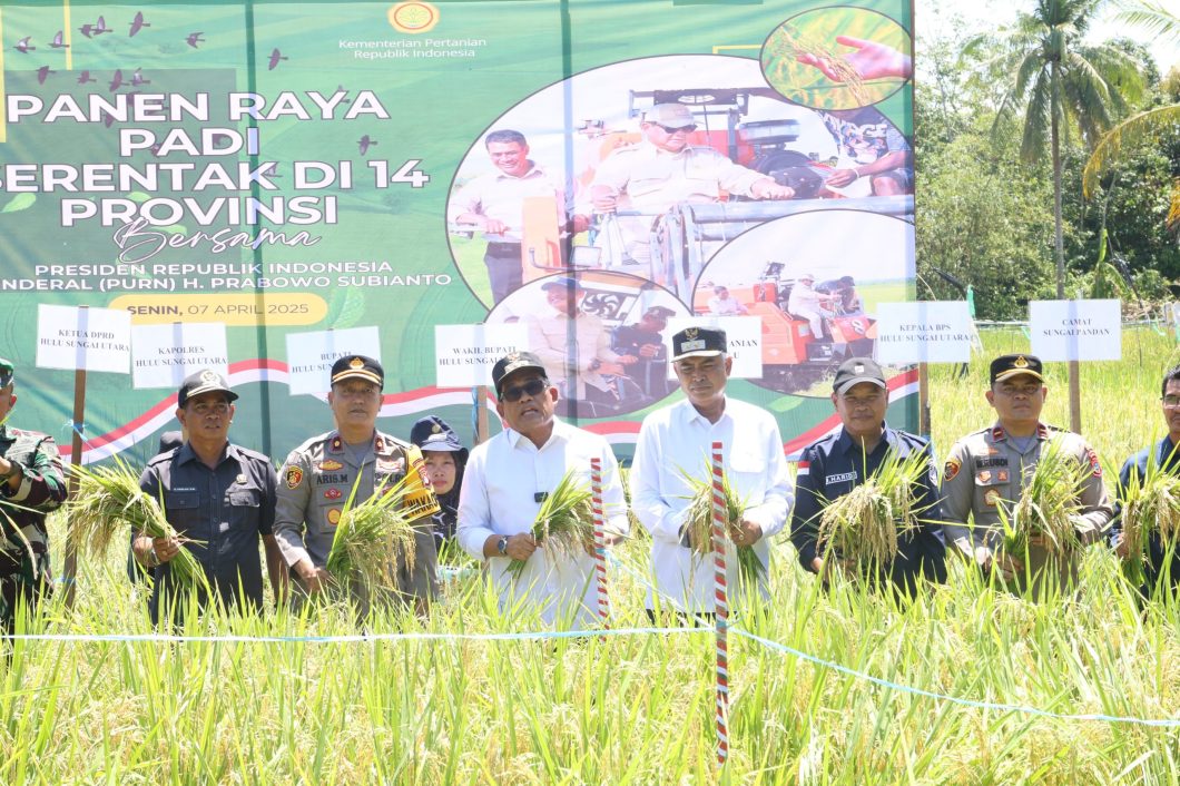 Wartaniaga.com. Amuntai— Komitmen Pemerintah Indonesia dalam mewujudkan swasembada pangan ditunjukkan melalui kegiatan Panen Raya Padi Serentak di 14 Provinsi, yang digelar pada Senin, (7/4/25) Presiden Republik Indonesia, Prabowo Subianto, memimpin jalannya kegiatan secara virtual melalui Zoom dari Majalengka, Jawa Barat, seraya menyampaikan pesan penting tentang visi Asta Cita, terutama dalam penguatan ketahanan pangan nasional.