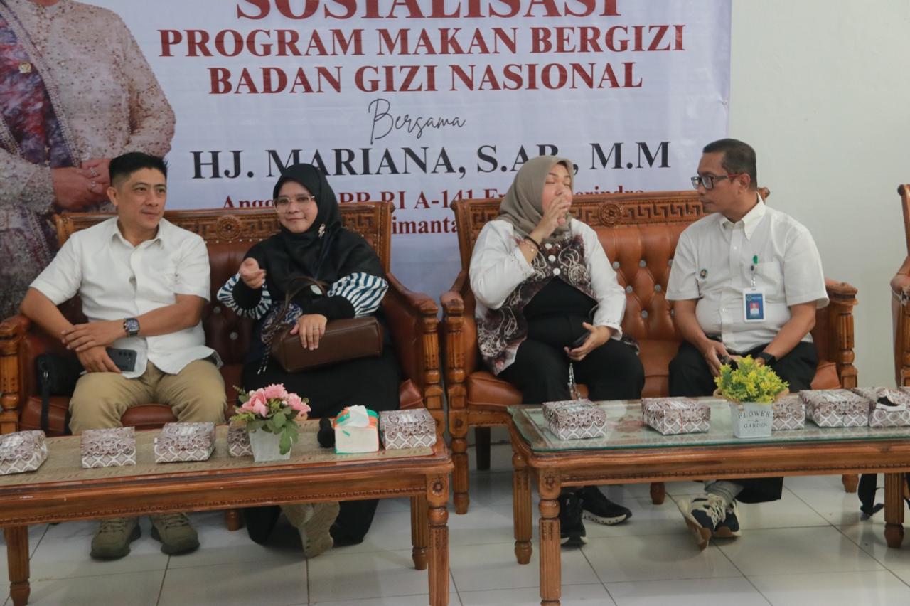 Sosialisasi program MBG dihadiri oleh anggota Komisi IX DPR RI Mariana, Tenaga Ahli Kerjasama dan Kemitraan Badan Gizi Nasional Imam Bachtiar Farianto, Pengawas farmasi dan Makanan Ahli Madya balai besar POM Banjarbaru Yuniar Ayu Handayani.
